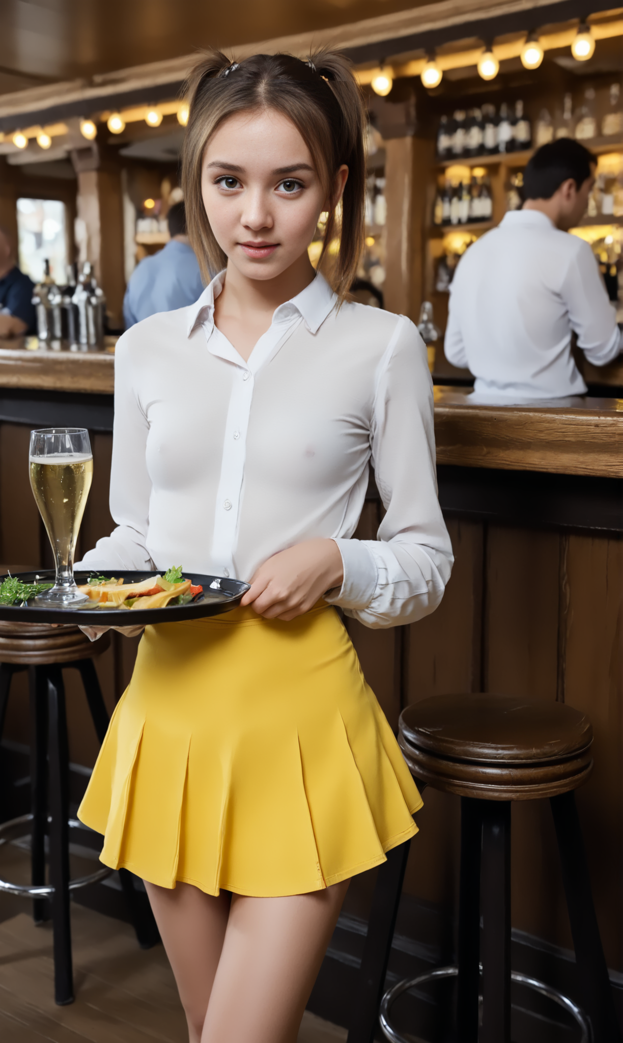 Serxyz_, 음료와 음식, 트레이를 든 소녀가 있는 펍, 소녀는 ...을 입고 있다_