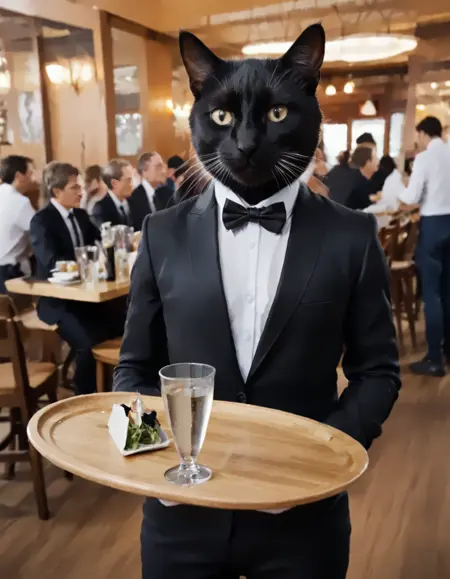 Serxyz_, 음식, 트레이를 든 소녀가 있는 레스토랑, 소녀는 ...을 입고 있다_