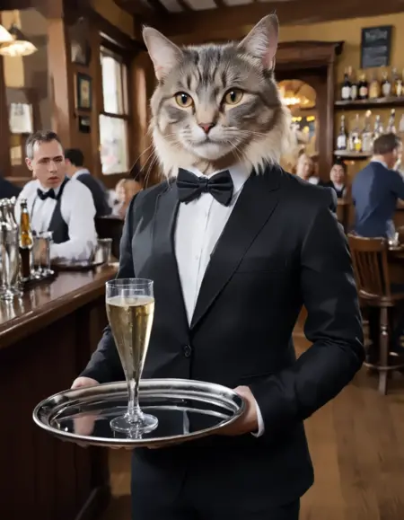 Serxyz_, 음료, 트레이를 든 소녀가 있는 펍, 소녀는 ...을 입고 있다_