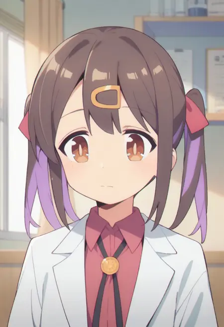 트리거 단어: oyama mihari, 머리 장식, 헤어클립, 짙은 갈색 머리, 갈색 눈, 보라색 비녀