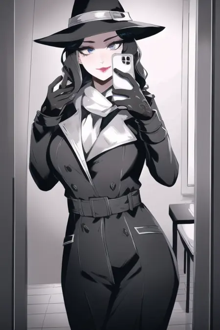 silvershroud, black hat, gray scarf, long black coat, black gloves, black pants, black shoes,