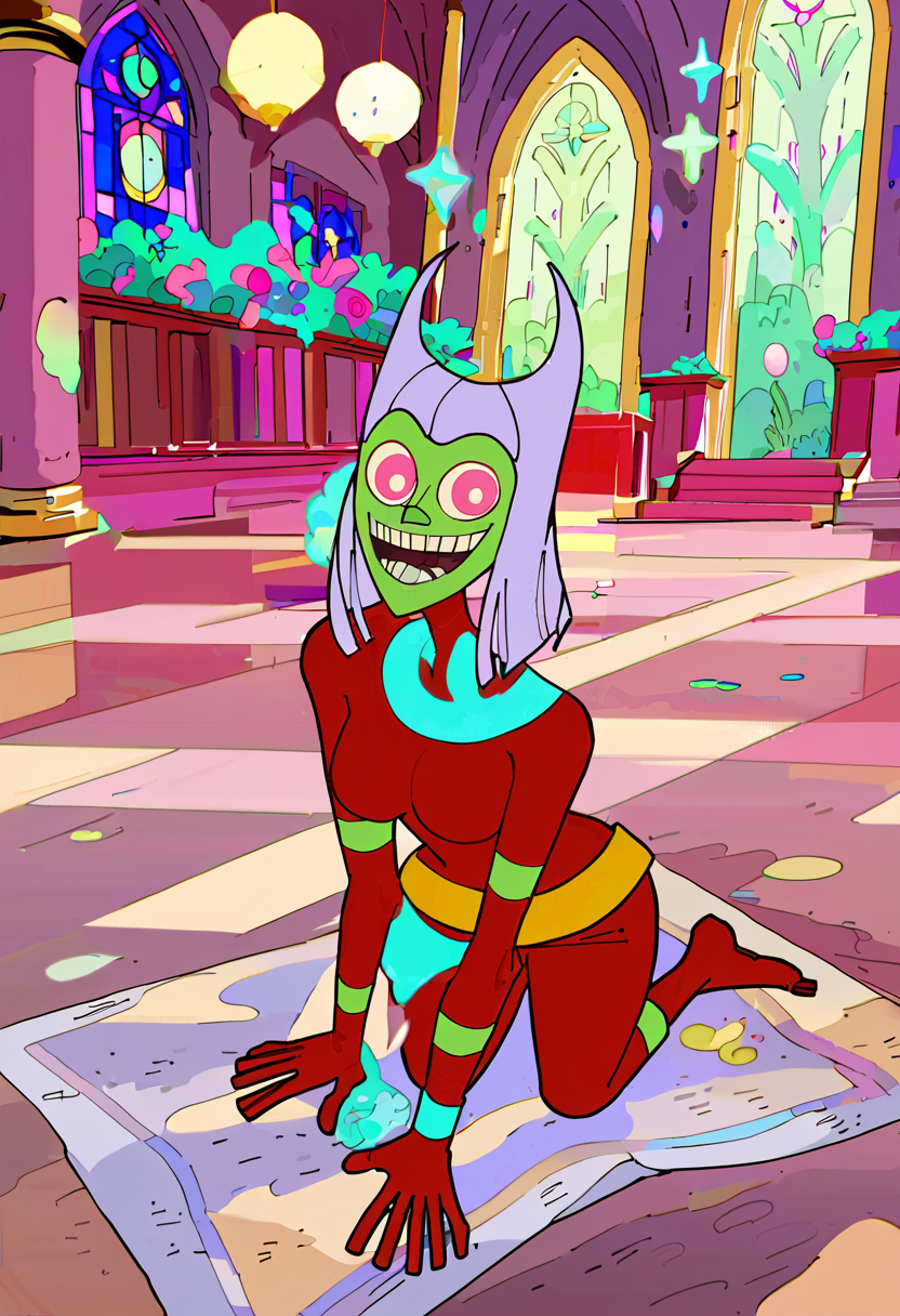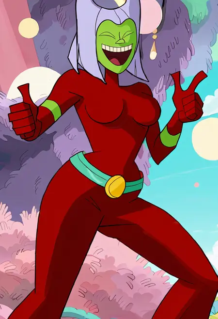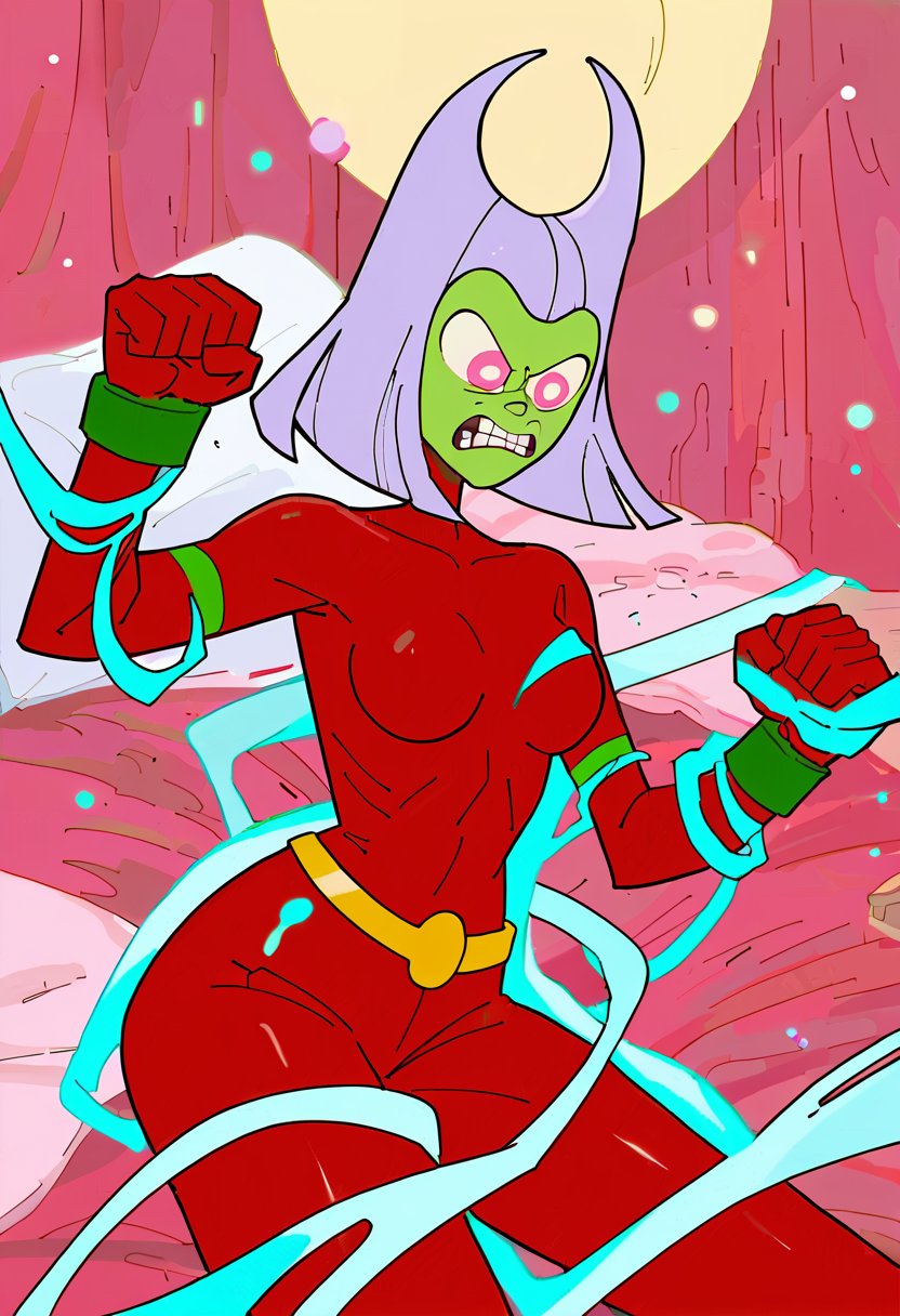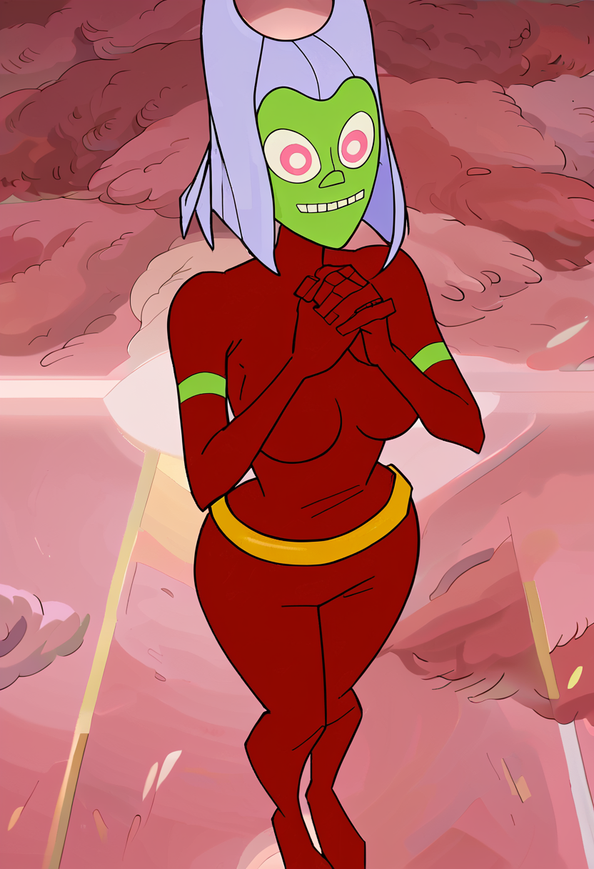 butt witch, butt witch (regular), twelve forever, 1girl, solo, colored skin, pink eyes, purple hair, bodysuit, green skin, red bodysuit
