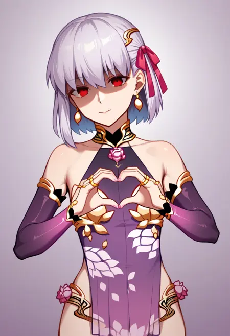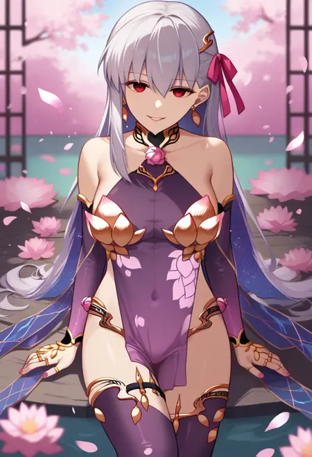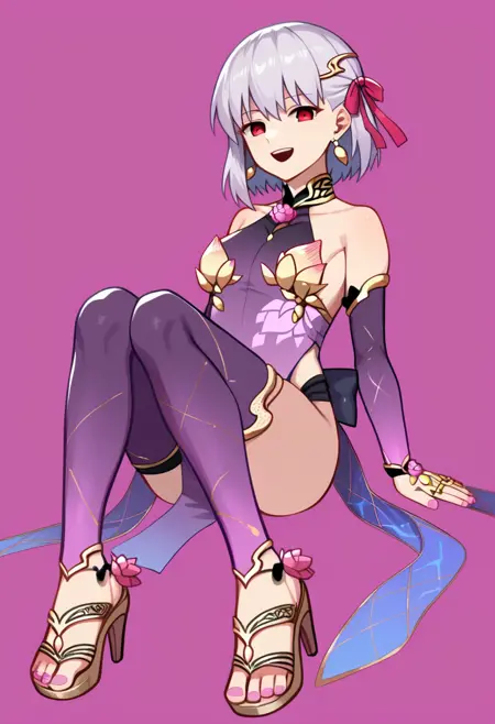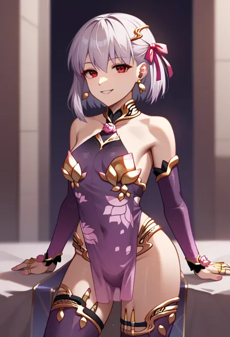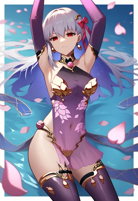 kama_\(fate\), kama_\(first_ascension\)_\(fate\), 1girl, red_eyes, hair_ribbon, earrings, short_hair, metal_collar, armlet, white_hair, small_breasts, thighs, thighlet, bare_shoulders, highres, detached_sleeves, purple_sleeves
