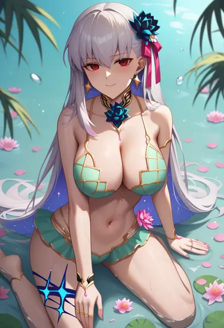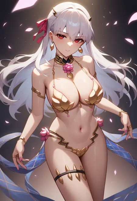 kama_\(fate\), kama_\(third_ascension\)_\(fate\), hair_ribbon, red_eyes, earrings, large_breasts, long_hair, 1girl, highres, white_hair, bikini_armor, navel, metal_collar, two-tone_hair, blue_hair, body_markings, cleavage