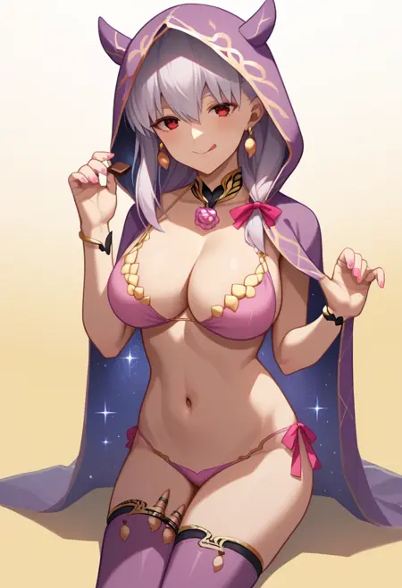 kama_\(chocolate_heaven\)_\(fate\), kama_\(fate\), 1girl, earrings, bare_shoulders, bracelet, horns, pink_bikini, hair_ribbon, highres, hooded_cloak, horned_hood, long_hair, large_breasts, armlet, white_hair, necklace