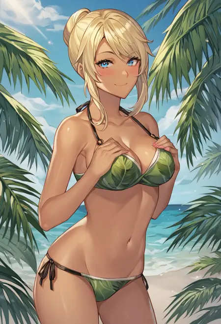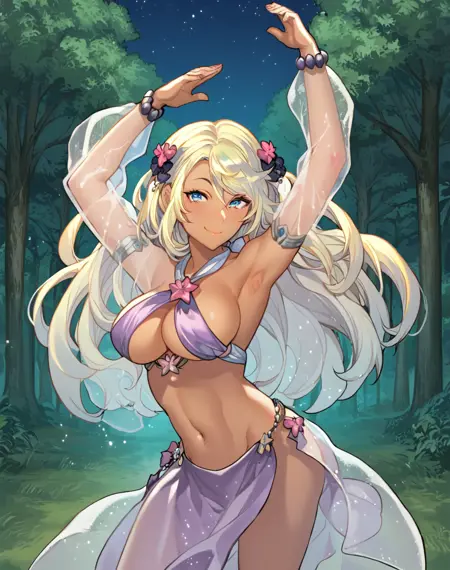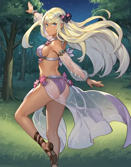Use sarong, tribe_outfit, tusk necklace, to trigger her default outfit, I put tribe_dancer_outfit but it make the hair colour be platinum blonde and more mossy, I suggest to use the harem dancer outfit lora (harem-dancer-xl-pony-by-edg)