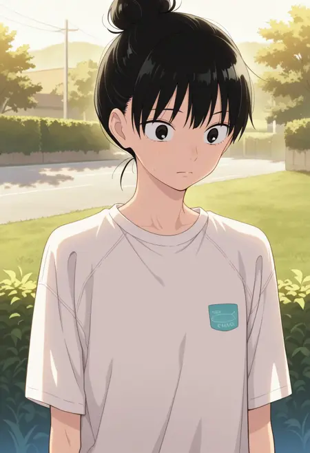 SawaKuronuma, 1girl, solo, black eyes, black hair, hair bun, single hair bun, t-shirt, white shirt,