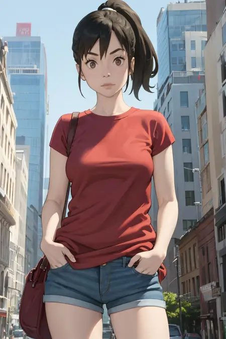 Mina, short hair, short ponytail, pink shirt, sleeveless shirt, denim shorts