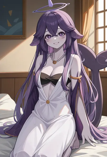 MegalodonVTuber, long hair, hair flaps, halo, cetacean tail, colored skin, necklace, white dress, plunging neckline, black bikini, bikini under clothes, detached sleeves, black sleeves
