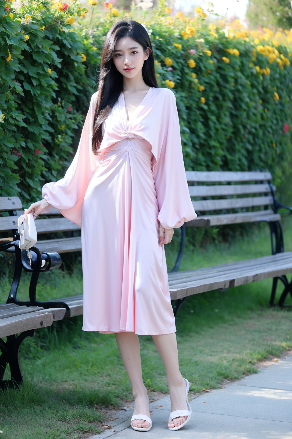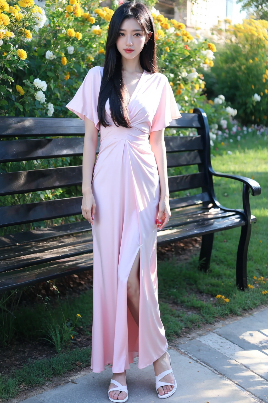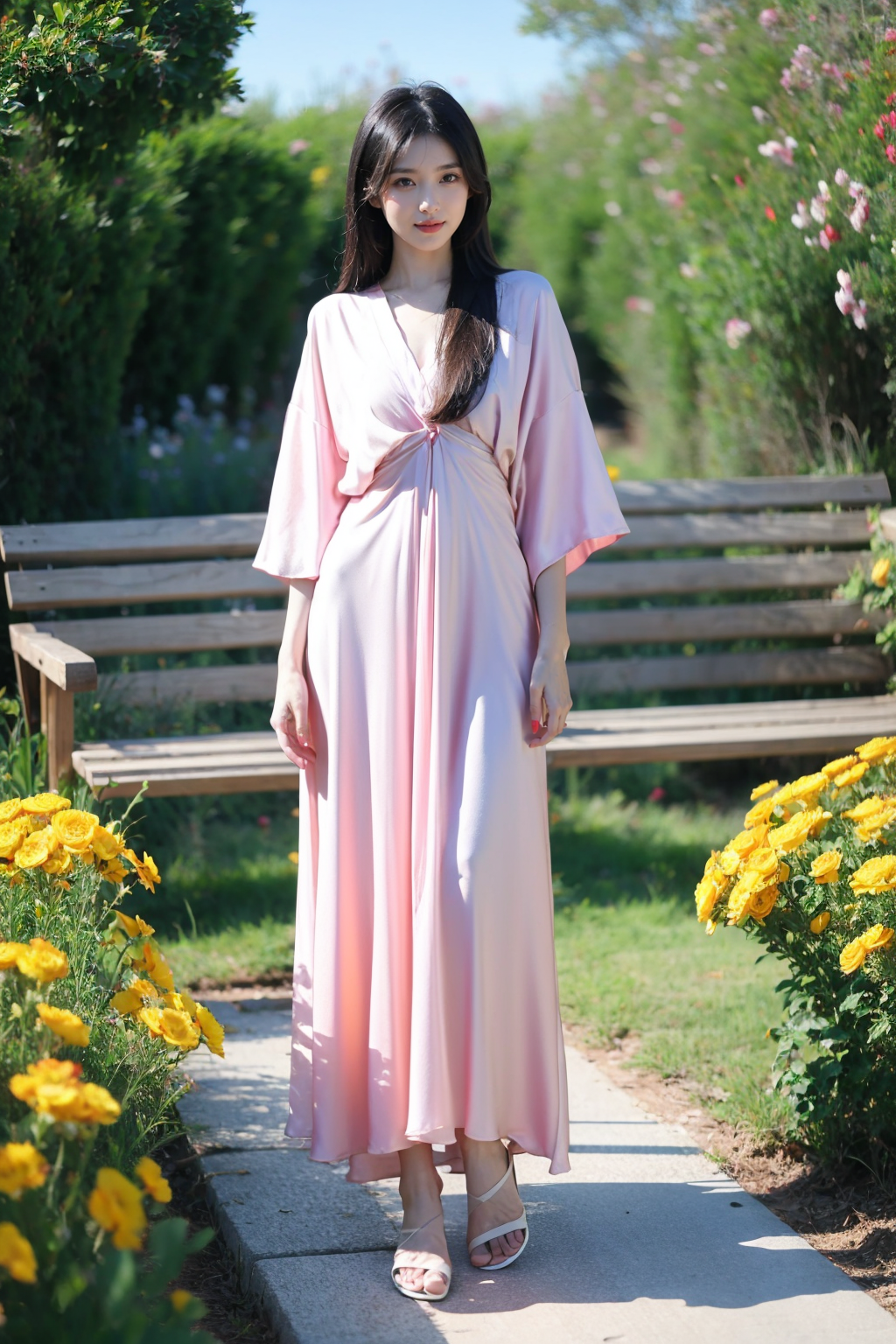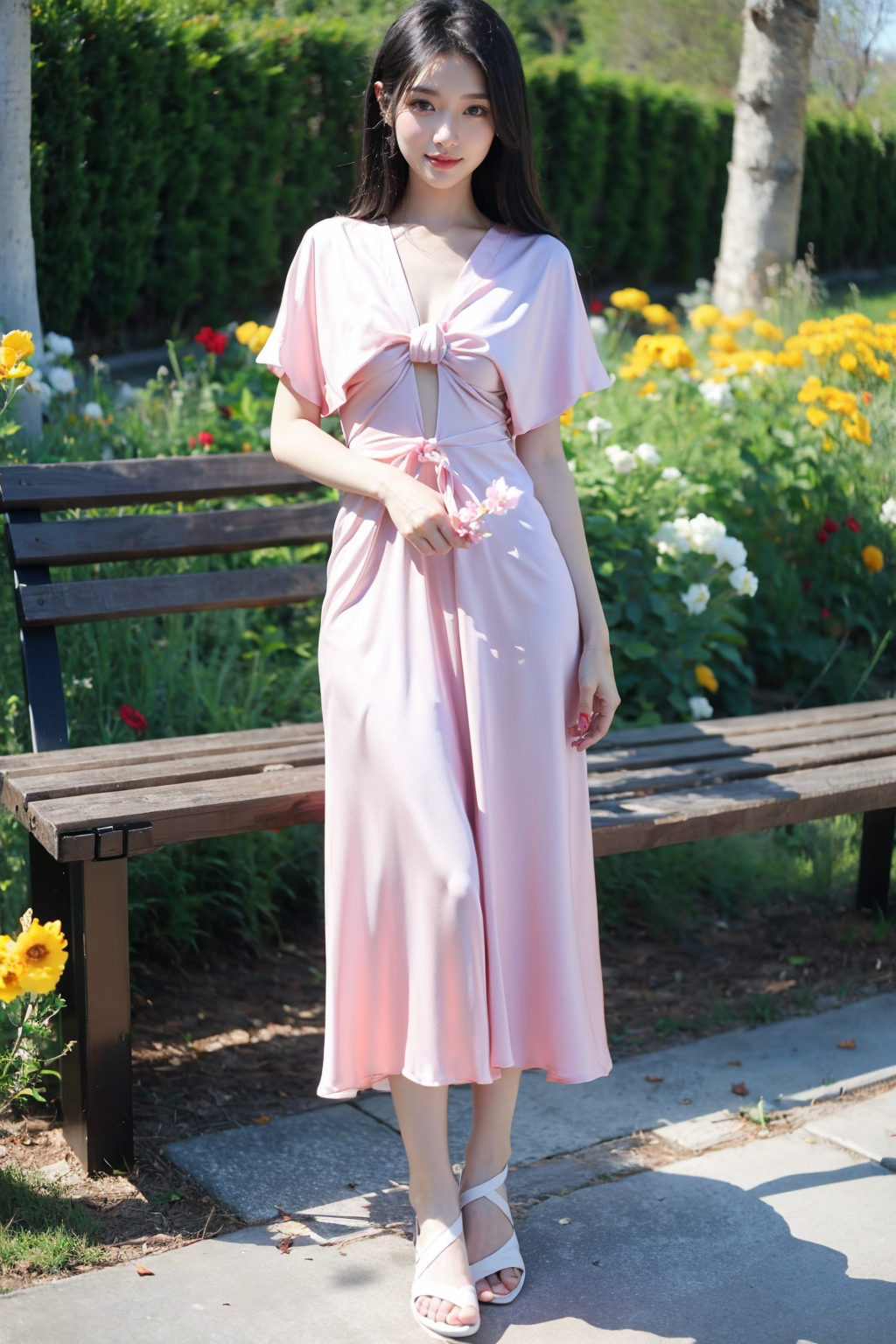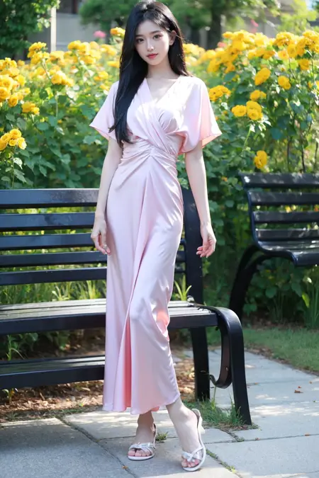 写实风格,真实感,摄影,杰作,最佳品质,超精细,极其详细的CG Unity 8K壁纸,(reality: 1.4),1个女孩,独自一人,长发,看着观众,黑发,连衣裙,全身照,白色粉红色衬衫,短袖,户外,白天,凉鞋,长椅,植物,黄花,美丽的手,真实感,照片背景,粉色连衣裙,lora:lora:0.8