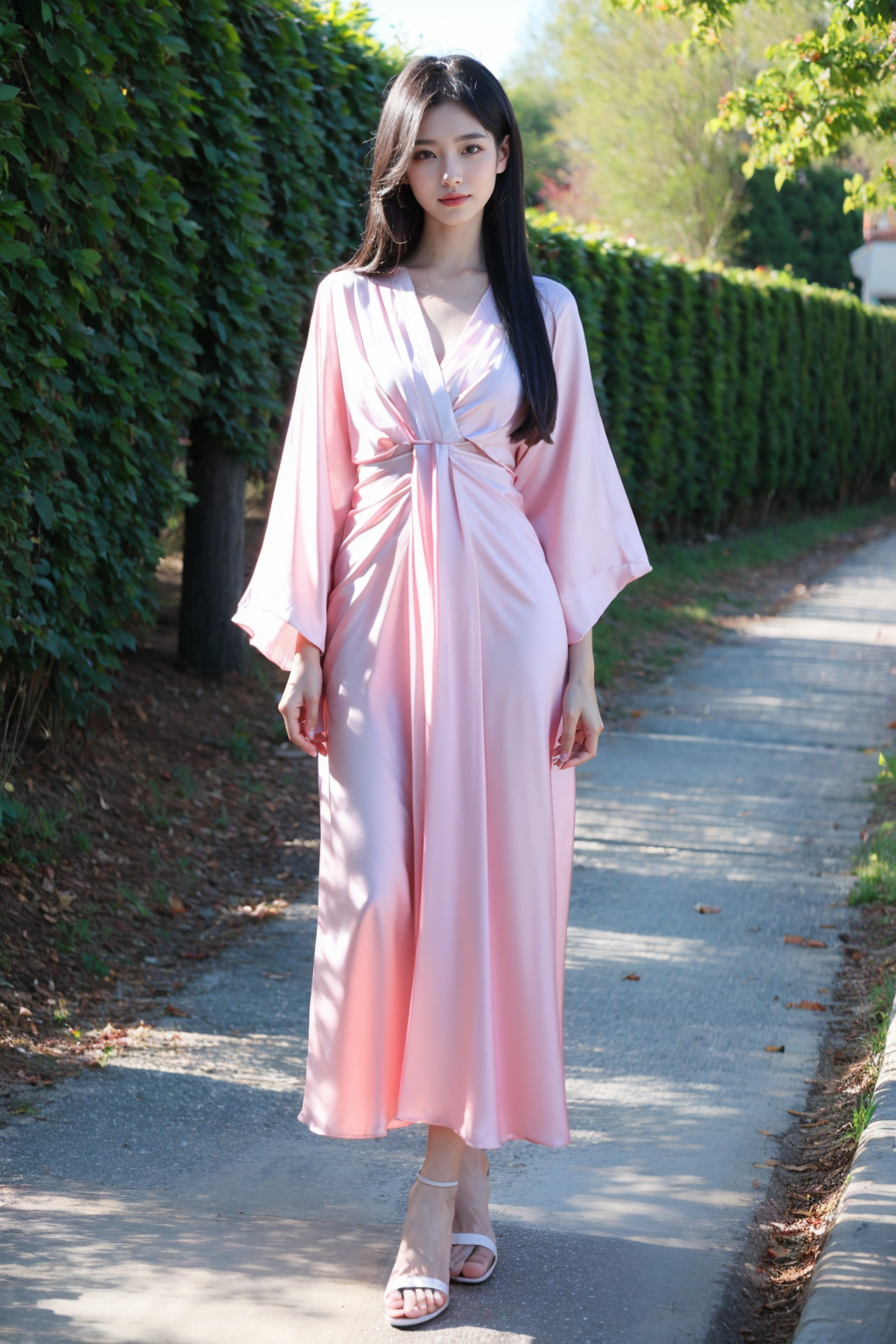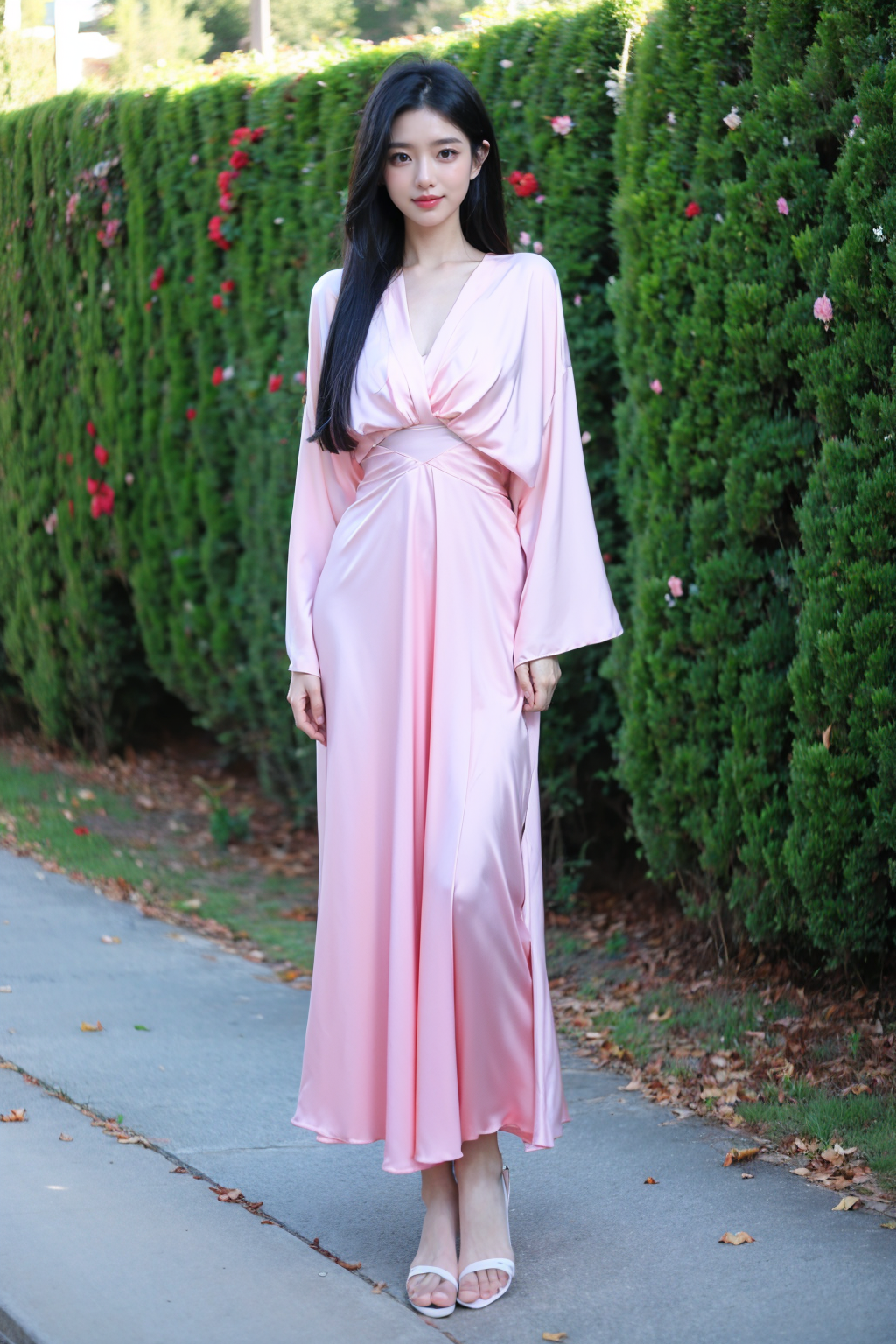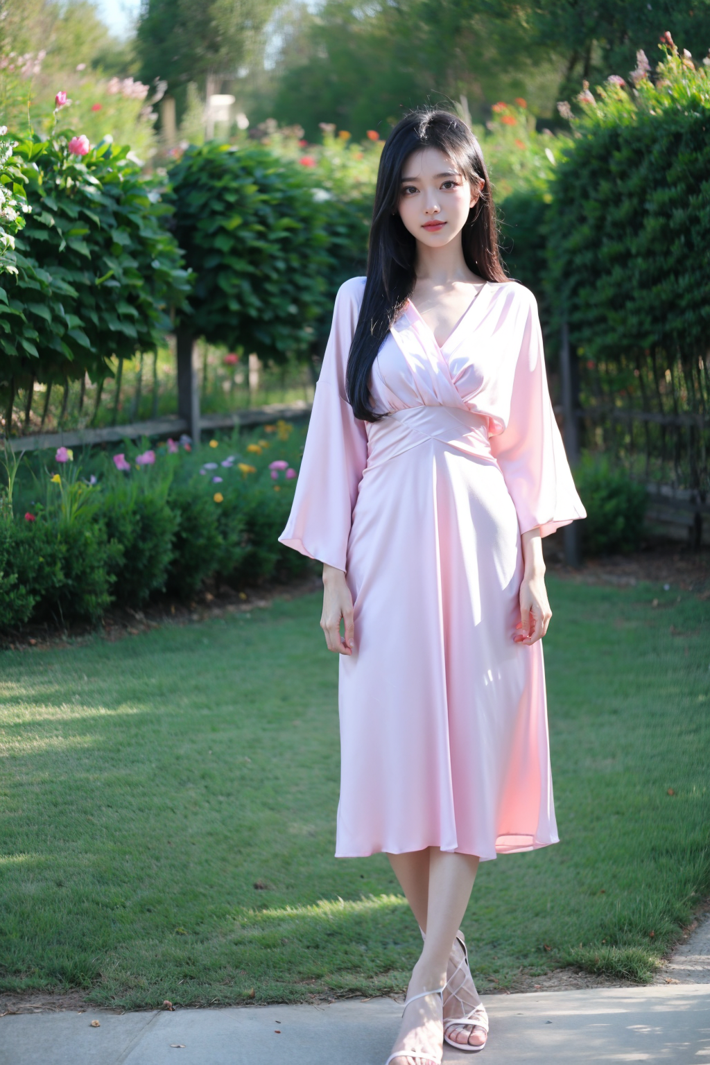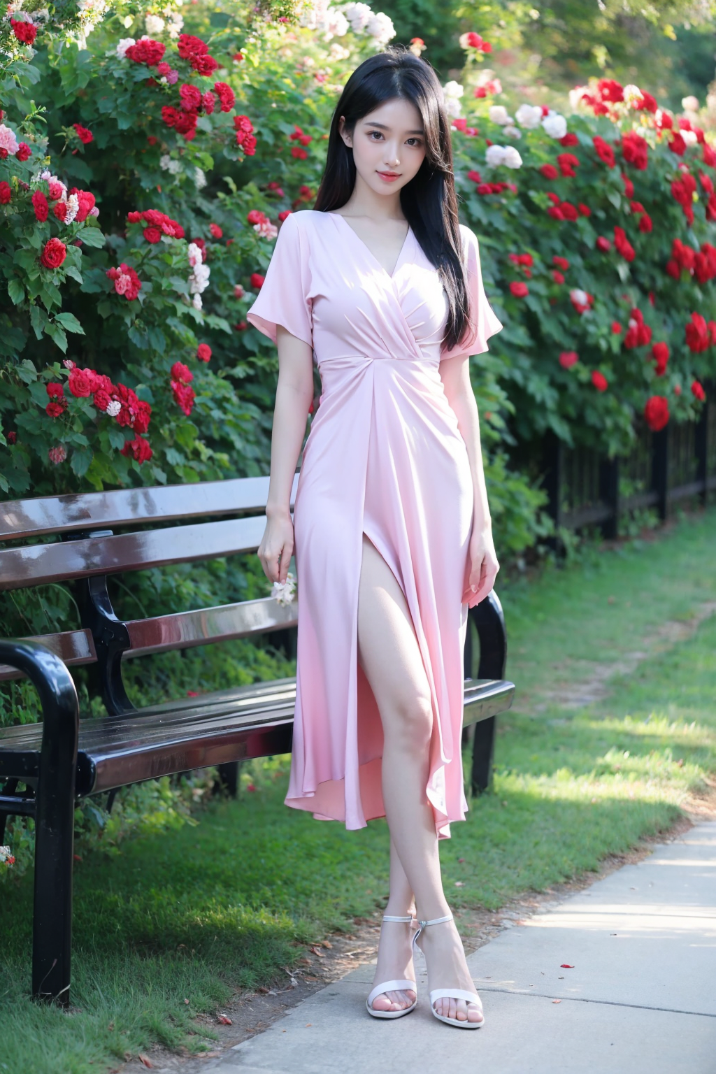 写实风格,真实感,摄影,杰作,最佳品质,超精细,极其详细的CG Unity 8K壁纸,(reality: 1.4),1个女孩,独自一人,长发,看着观众,黑发,连衣裙,全身照,白色粉红色衬衫,短袖,户外,白天,凉鞋,长椅,植物,黄花,美丽的手,真实感,照片背景,粉色连衣裙,lora:lora:0.8