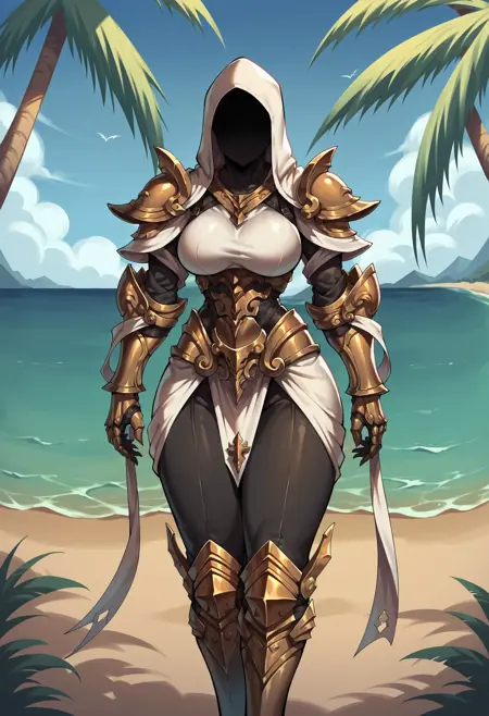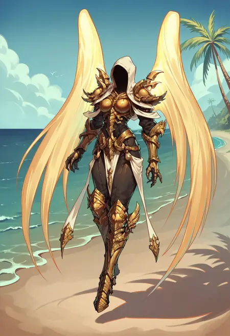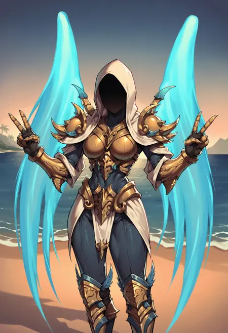 breasts, armor, wings, hood, hood up, faceless, shoulder armor, gauntlets, boots, glowing