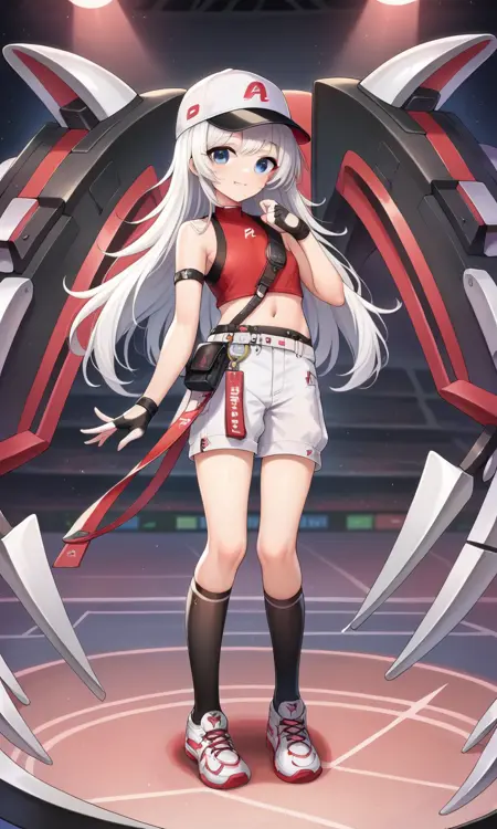 Futakuchi, white long hair, black eyes, red and black crop top, white shorts, white sneakers, baseball cap, midriff, bare shoulder, fingerless gloves, black socks