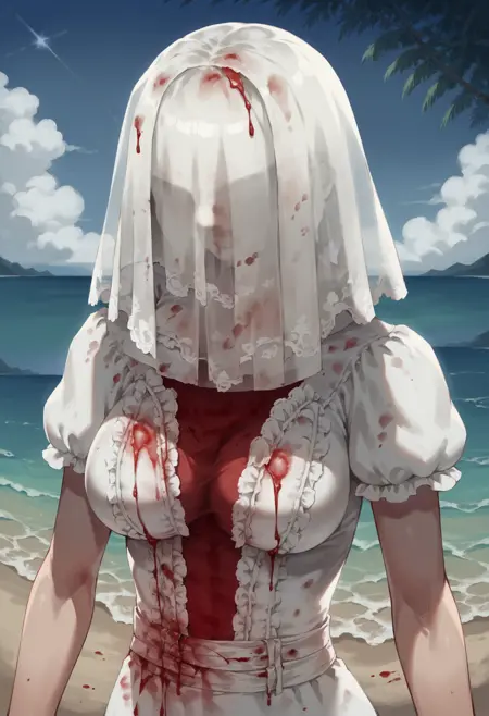 花嫁:dress, white dress, veil, wedding dress, short sleeves, blood, blood on clothes