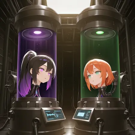 Tags (type 3 - head in container): head in container,disembodied head,cable,dullahan,on machinery,underwater,stasis tank,air bubble,