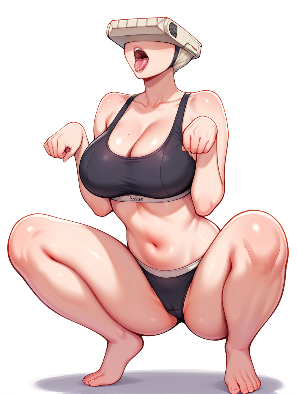 タグ(タイプ1 - ホログラム・デュラハン - すぐにコピー用):アクアフェイス、アクアホログラム、ゲームスタイル、3D、透明な顔、透明な頭、透明な髪、頭から背景が見える、黒いカラー、ホログラム・デュラハン、透明な腕、透明な脚、黒い太ももストラップ、黒いアームレット、人間なし、バーコードの陰毛タトゥー