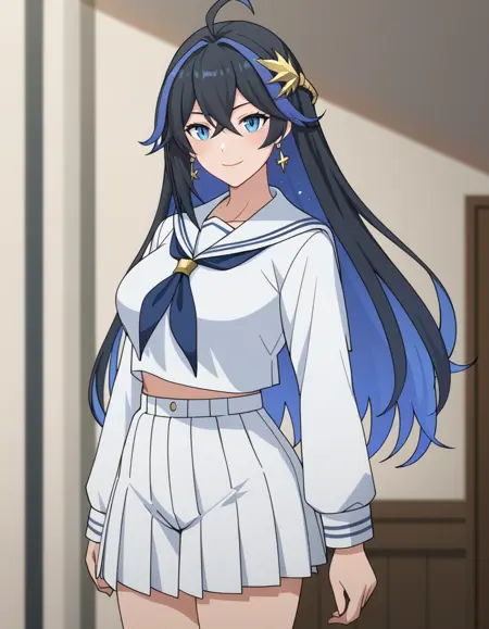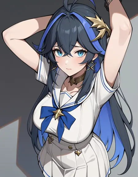 aerwen,1girl,solo,breasts,blue eyes,long hair,blue hair,bangs,cleavage,black hair,hair ornament,star \(symbol\),jewelry,earrings,hair between eyes,multicolored hair,large breasts,crossed bangs,tattoo,ahoge,