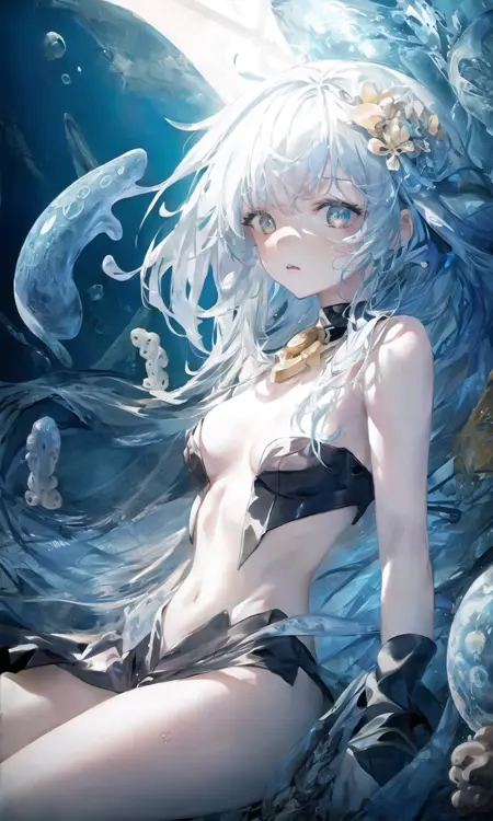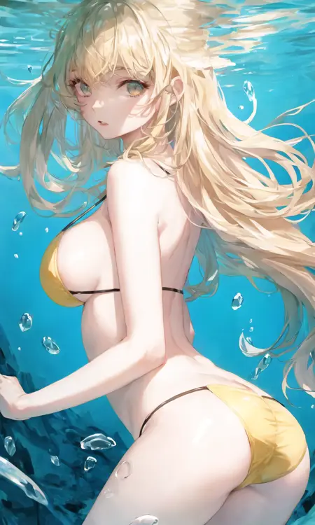 (1girl, (long golden wavy hair),(red and white frilled bikini:1.2),(the girl is floating in the water),(seaweeds,fish,sunlight),shiny eyes,beautiful detailed eyes,elegant eyelashes,beautiful detailed face,(an extremely delicate and beautiful) , studio photography, extremely detailed wallpaper ,hair hangs down to the shoulder, eyes visible through hair ,eyelashes covered by hair,(small breasts))