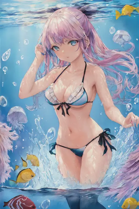 (1girl, (long golden wavy hair), (red and white frilled bikini:1.2), (the girl is floating in the water), (seaweeds, fish, sunlight), shiny eyes, beautiful detailed eyes, elegant eyelashes, beautiful detailed face, (an extremely delicate and beautiful), studio photography, extremely detailed wallpaper, hair hangs down to the shoulder, eyes visible through hair, eyelashes covered by hair, (small breasts))