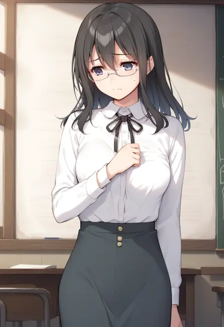 선생님: 키리카, 선생님, 안경, 검은 머리, 눈 사이 머리, 중간 크기 가슴, 성숙한 여성, 셔츠, 치마, 목 립,