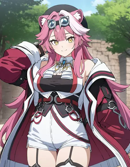 衣装:white shorts, open jacket, garter straps, white thighhighs