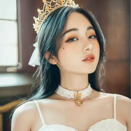 例如 ssugar008 女孩肩上披著一條透明的白色披肩,露出底下的白色蕾絲內衣。她站在明亮的房間裡,一手握住披肩,另一手搭在臀部。她的頭髮很長,略呈波浪狀。