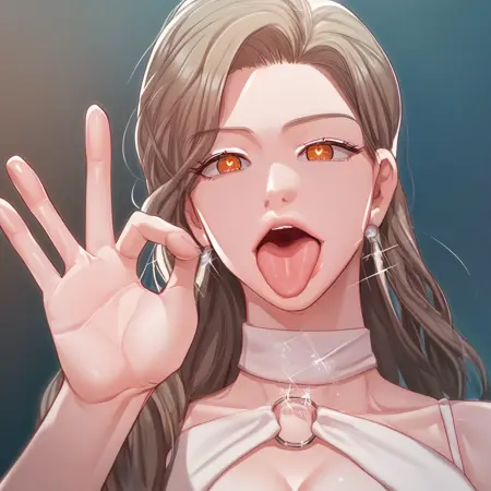 14. ((오픈된 검은 가죽 자켓, 흰 상의, 저속한 가슴선, 엄청난 가슴선, 허리, 청바지, 긴 귀걸이 ))