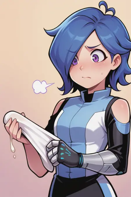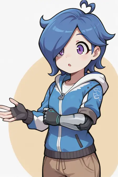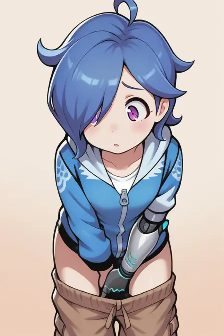 Tari: tari, blue hair, purples eyes, blue hoodie, mechanical arm, tan pants
