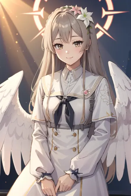 recommended prompt: kirifuji nagisa, long hair, smile, bangs, hair ornament, dress, long sleeves, wings, hair flower, neckerchief, halo