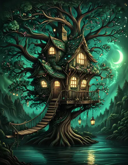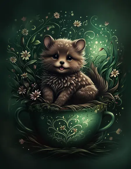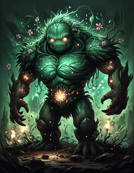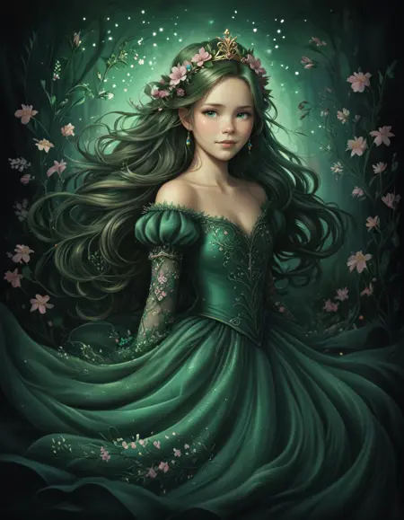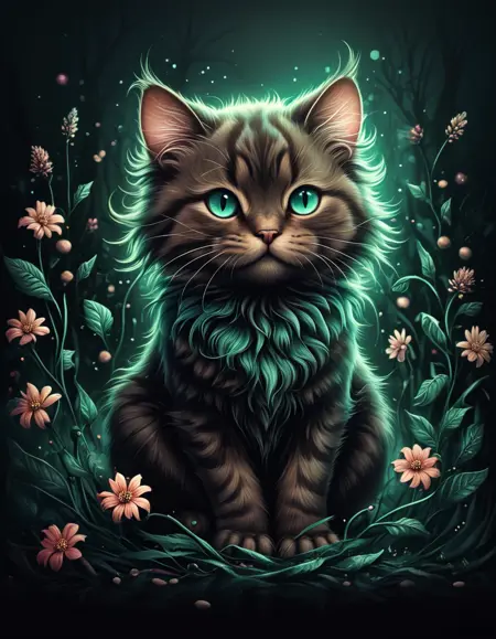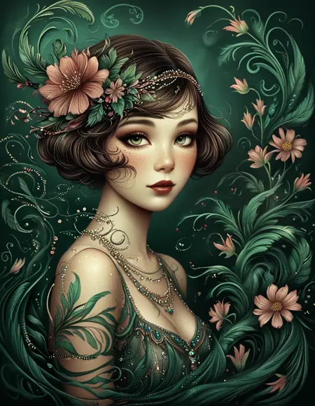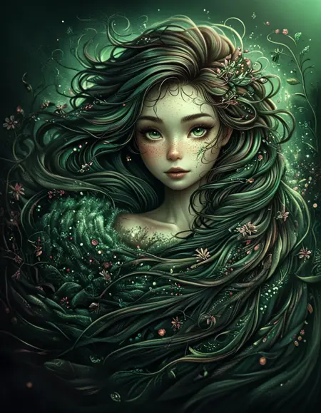 这种魔法风格以漩涡、花卉和美丽的光影为特色,主色调为从绿色到青绿色的色系,粉色为点缀色。如需更强的效果,请在提示词中添加“漩涡”或“魔法光影”。