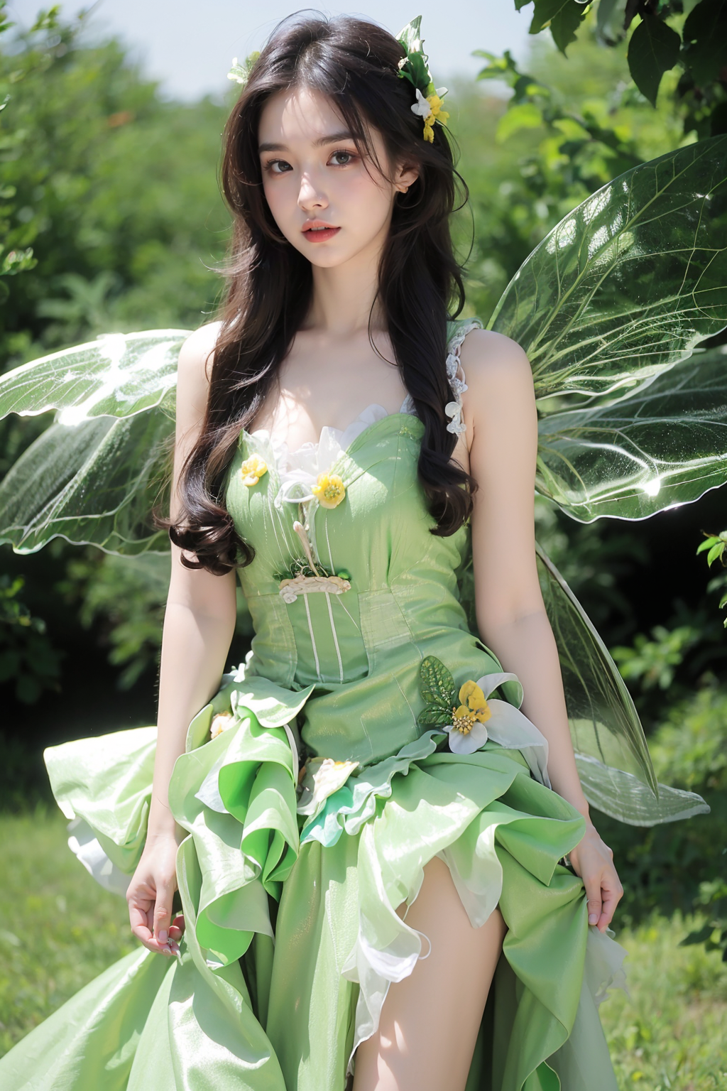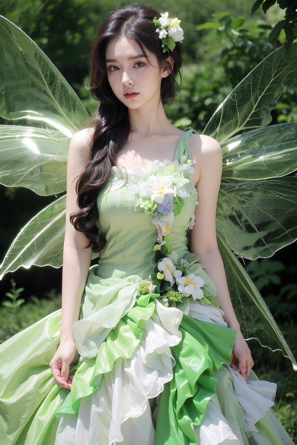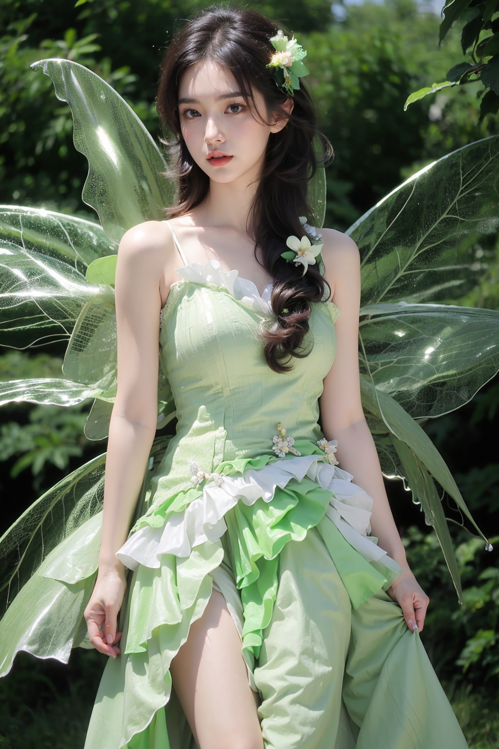 プロンプト: photorealistic,realistic,photography,masterpiece,best quality,ultra-detailed,extremely detailed,8k wallpaper,(reality: 1.4),1girl,solo, tall,hair flower,full body,standing,arms lowered to the sides,long hair,black hair,hair ornament,dress,plant,wings, flower dress,green butterfly dress,frilled dress,fairy wings,green theme,fairy, <lora:JAY - GREEN BUTTERFLY DRESS:0.8>