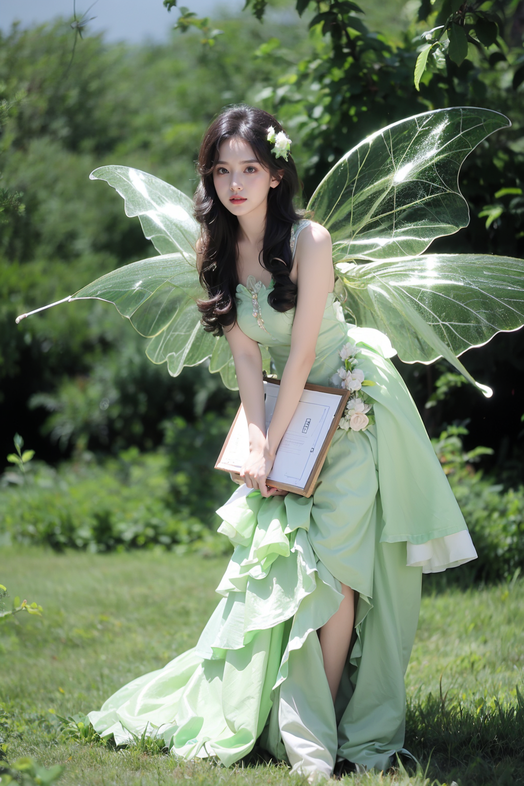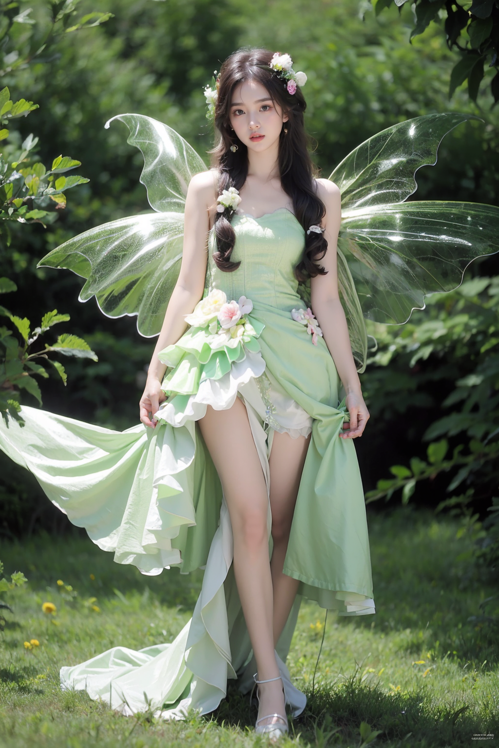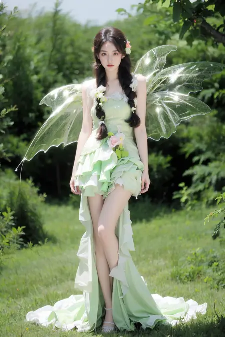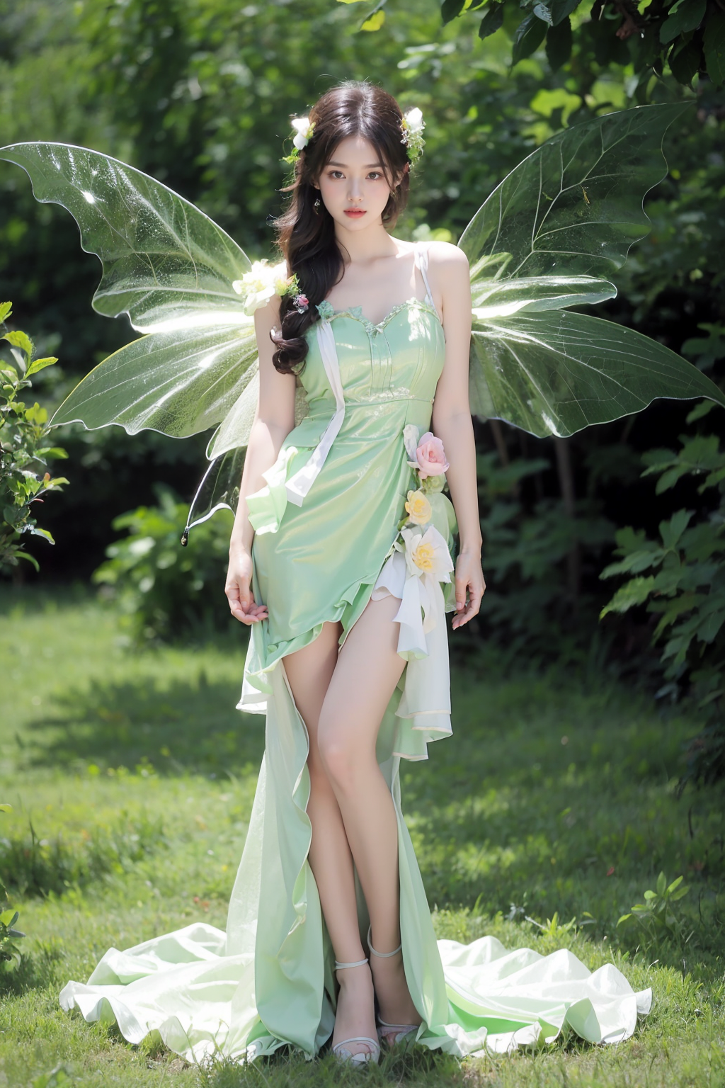 プロンプト: photorealistic,realistic,photography,masterpiece,best quality,ultra-detailed,extremely detailed,8k wallpaper,(reality: 1.4),1girl,solo, tall,hair flower,full body,standing,arms lowered to the sides,long hair,black hair,hair ornament,dress,plant,wings, flower dress,green butterfly dress,frilled dress,fairy wings,green theme,fairy, <lora:JAY - GREEN BUTTERFLY DRESS:0.8>