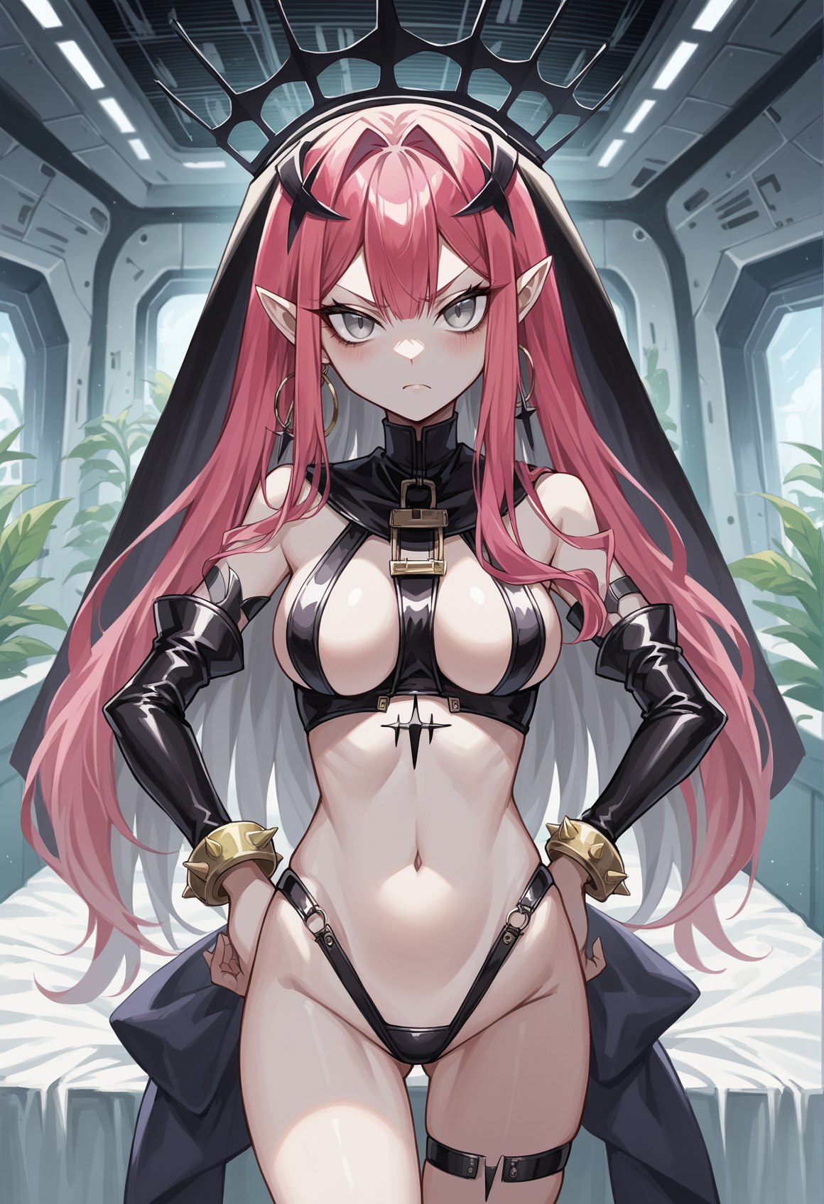 프리텐더: 뾰족한 귀, 분홍색 머리카락, 매우 긴 머리, 회색 눈, 캐릭터 후드, 털 장식, 털장식 재킷, 갈퀴, 뿔, 짧은 드레스, 가슴 노출, 배꼽, 허벅지 스트랩, 플랫폼 신발