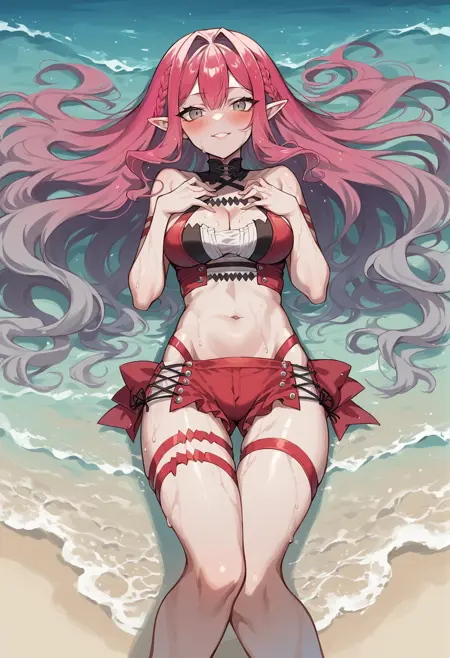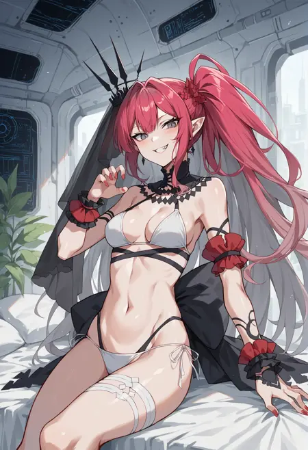 프리텐더3: 뾰족한 귀, 분홍색 머리카락, 매우 긴 머리, 회색 눈, 머리 장식, 머리 꽃, 베일, 흰색 비키니, 스트링 비키니, 분리형 칼라, 손목 커프스, 비대칭 하의, 네일 포일