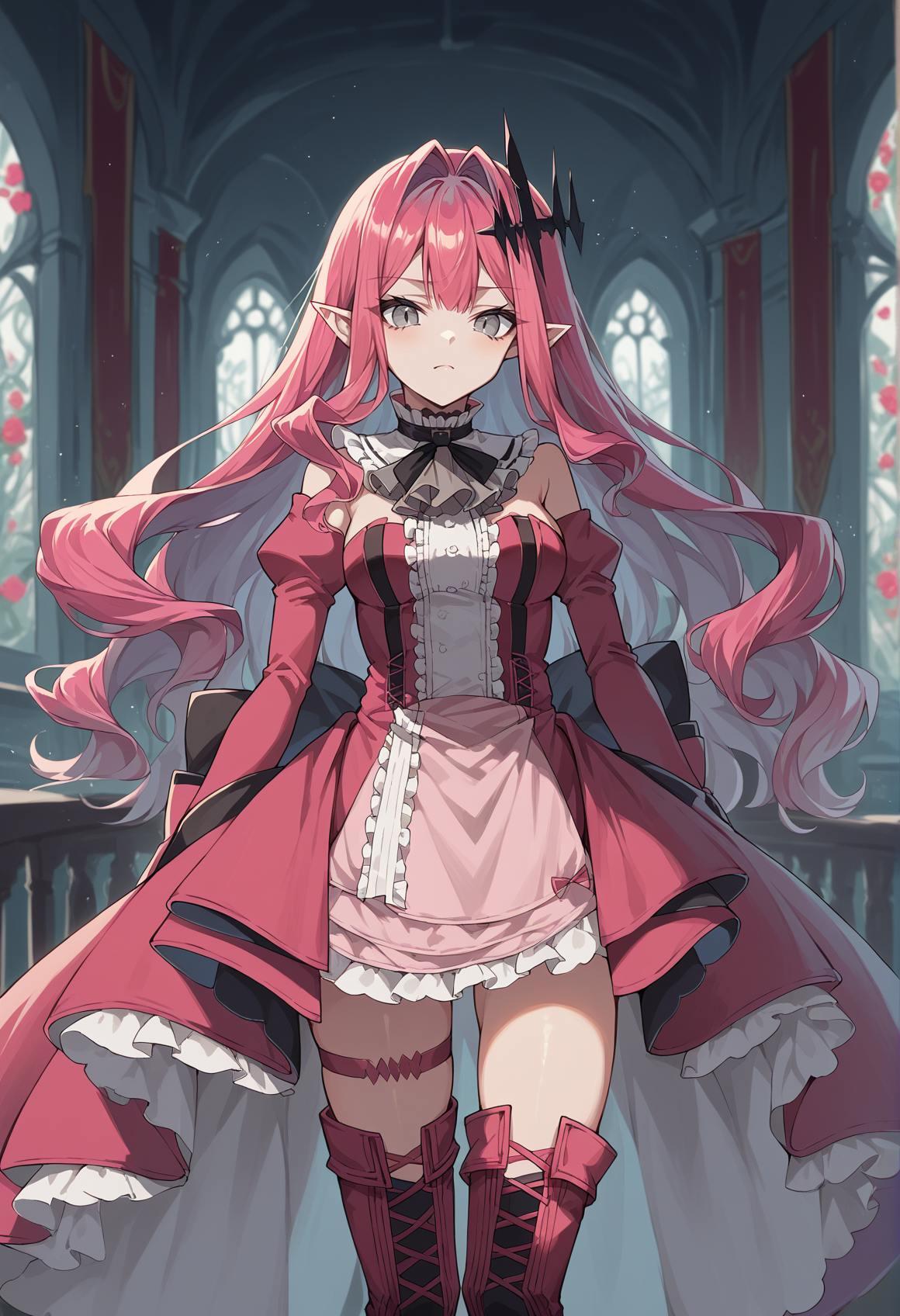 바닐라1: 뾰족한 귀, 분홍색 머리카락, 매우 긴 머리, 회색 눈, 머리 장식, 애스콧, 리본, 분홍 드레스, 긴 소매, 분리형 소매, 풍성한 소매, 허벅지 스트랩, 허벅지 부츠, 제타이 리ョ우이키, 프릴