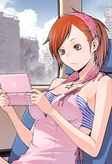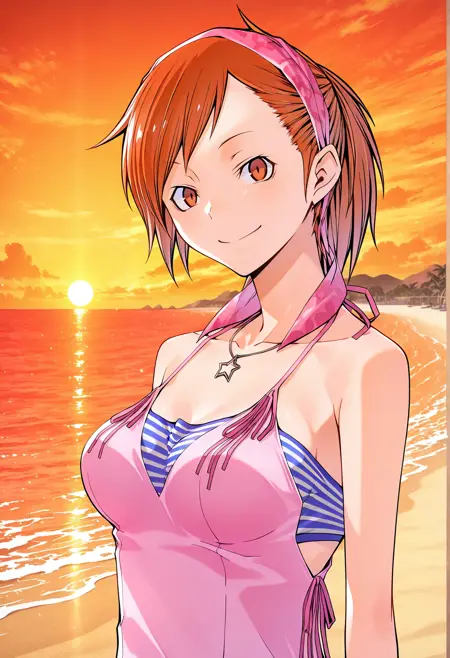 Random information: If you plan to prompt for the star necklace, sometimes it will create star pendants where the bandana should be because of training images where the necklace is floating, can usually be fixed by prompting for the bandana. The bandana does not need to be prompted for usually and I have no idea if it can be removed because its in every picture of the dataset. When prompting for the striped bandeau without the pink camisole may need to prompt for strapless