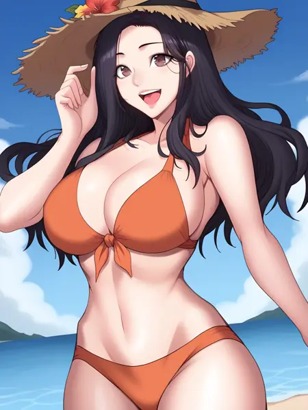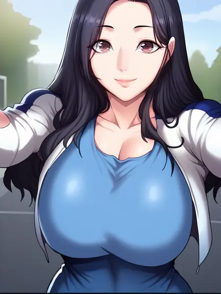태그: chunhwa,1girl, black hair,large breasts, brown eyes,