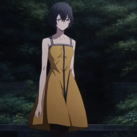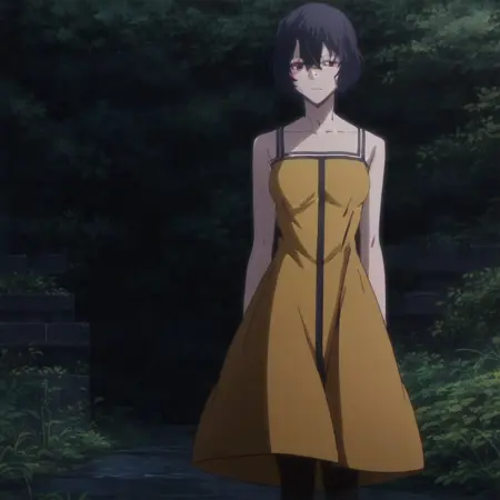 Elena Aoki, short hair, dark blue hair, red eyes, sundress, pantyhose