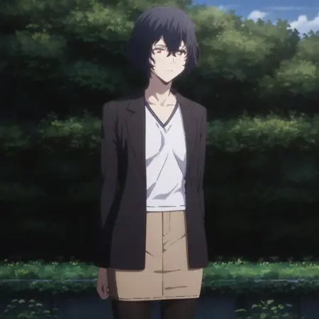 Elena Aoki, short hair, dark blue hair, red eyes, black jacket, white shirt, skirt pantyhose,