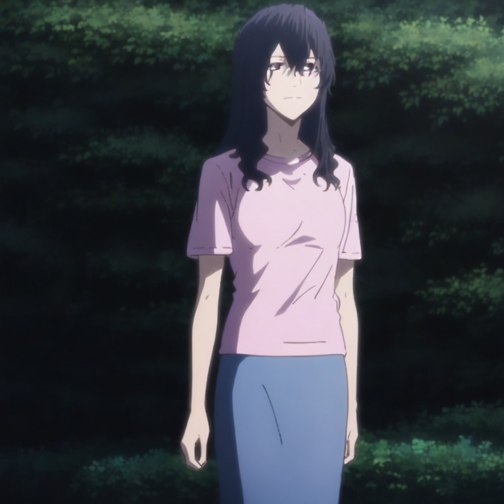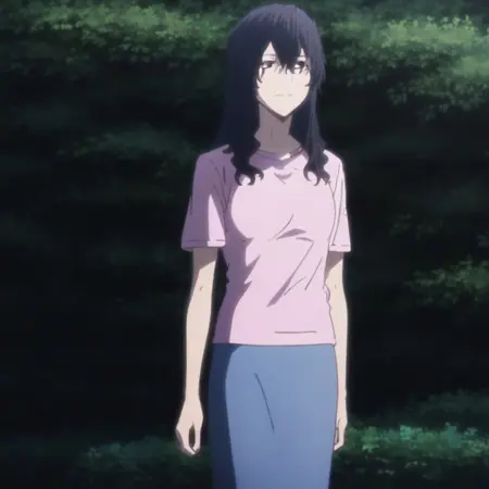Elena Aoki, long hair, dark blue hair, red eyes, pink t-shirt, long skirt, blue skirt