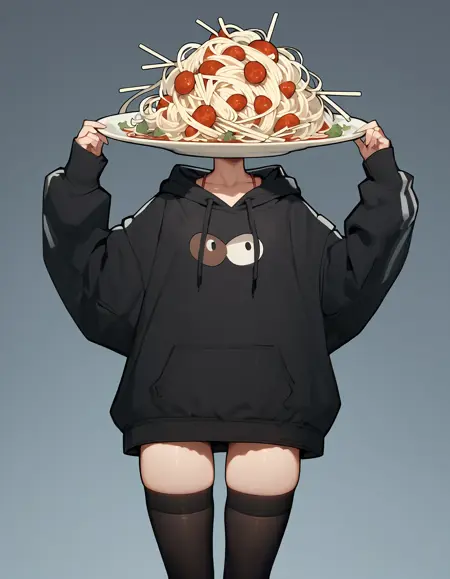 h3ad,object_head,chinese noodles ,black hoodie,thighhighs, , score_9, score_8_up, score_7_up, score_6_up, score_5_up, score_4_up, food_focus
