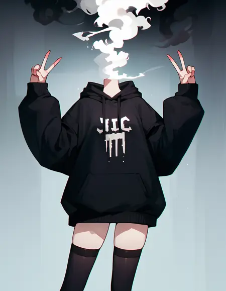 headless,smoke,black hoodie,thighhighs, score_9, score_8_up, score_7_up, score_6_up, score_5_up, score_4_up,v, peace