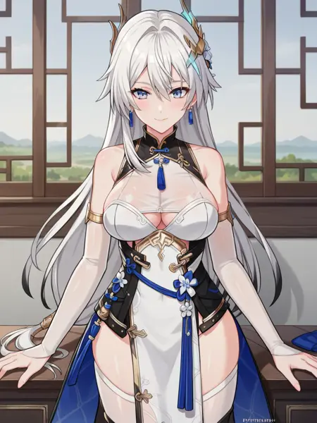 Gengchen_AG, Whispering_Waves_outfit, 1girl, solo, breasts, dress, white thighhighs, gloves, white dress, looking at viewer, flower, long hair, hair ornament, white thighhighs, white gloves, pelvic curtain, large breasts, blue flower, elbow gloves, cleavage, bare shoulders, white hair, hair between eyes, hair flower, standing, blue rose, rose, grey eyes, sideboob