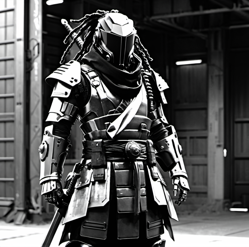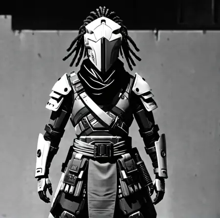 weapon, sword, armor, helmet, greyscale, solo, monochrome, katana, sheath, sheathed, 1other, japanese armor, scarf, covered face, shoulder armor, humanoid robot, samurai, science fiction, cowboy shot, standing, cyberpunk, futuristic armor, robot helmet, LED visor, black and white, sci-fi, dystopian, mechanical glove, industrial background, armored gauntlets, dreadlocks, masked figure, augmented reality, cybernetic, arm plating, combat ready, metallic texture, digital art, high-contrast, urban warrior, cyber warrior, pose, cybernetic enhancements, robotic appearance, action figure。