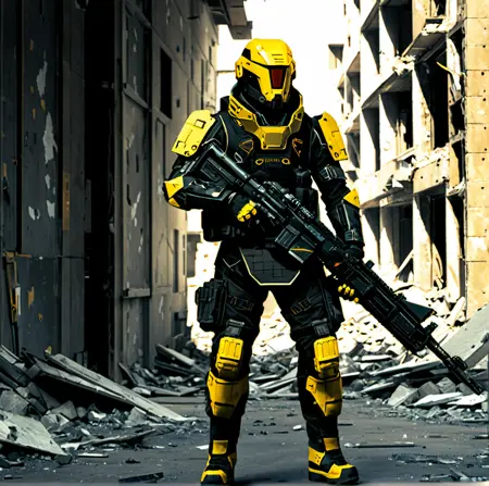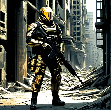 weapon, gun, solo, 1girl, science fiction, cloak, hood, holding weapon, holding, realistic, outdoors, blurry background, holding gun, helmet, blurry, rifle, cyborg, hooded cloak, nature, mask, facing viewer, cape, forest, hood up, tree, cyberpunk, futuristic, female, robotic suit, augmented reality glasses, forest background, sci-fi character, black and gray color scheme, tactical gear, body armor, high-tech weaponry, pistol, standing pose, serious expression, creative makeup, science fiction theme, advanced technology, enhanced soldier, detailed costume, concept art, daylight, focused lighting, digital art, textured fabrics, intricate design, original character