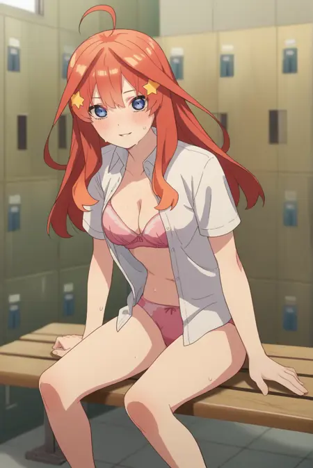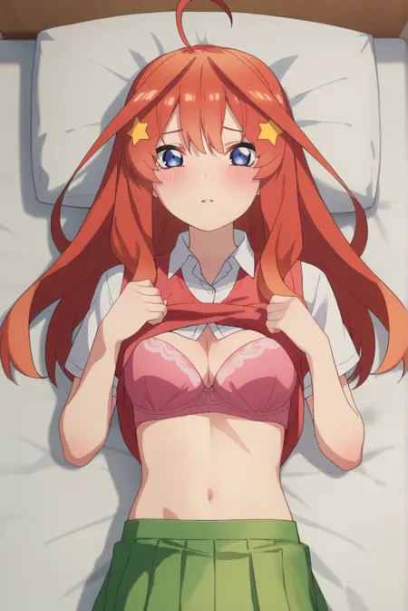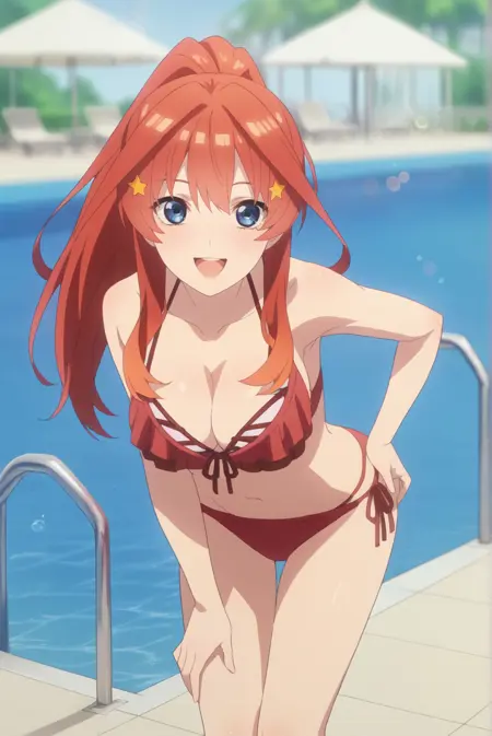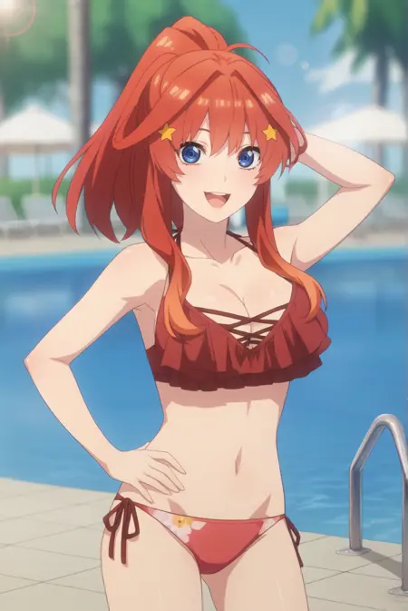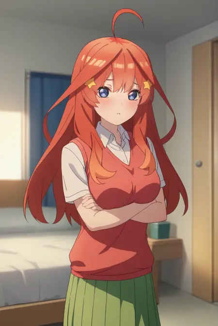 <lora:ItsukiNakanoXL-v1-05:0.7>, ChopioItsuki, 赤髪, 長髪, サイドロール, 光沢のある髪, 青い目, 視線を観察者に向けた,