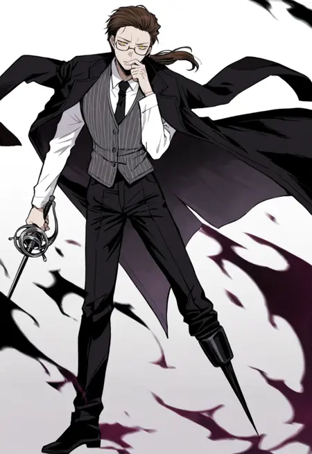 GregorNightAwls, hair slicked back, glasses, white shirt, black necktie, grey striped vest, black coat on shoulders, black pants, long peg leg, asymmetrical clothes, black footwear