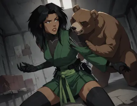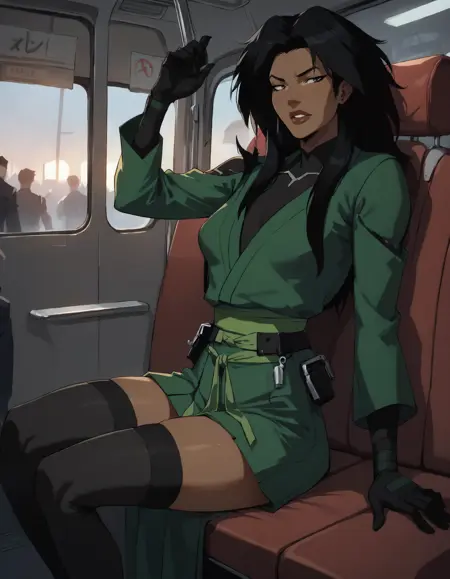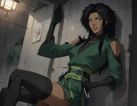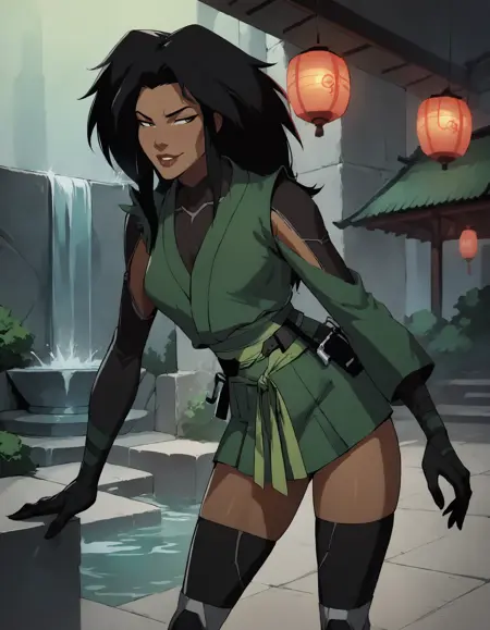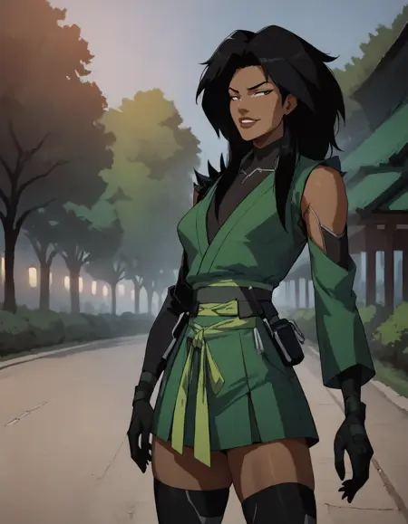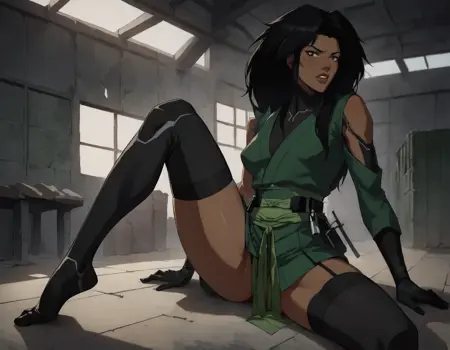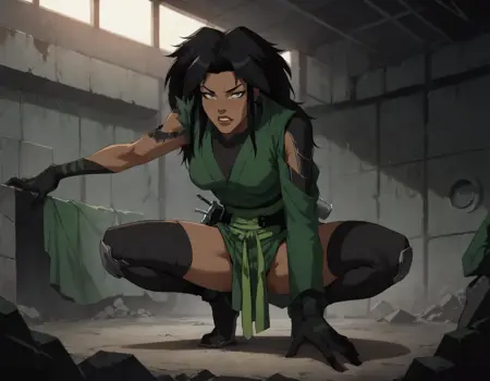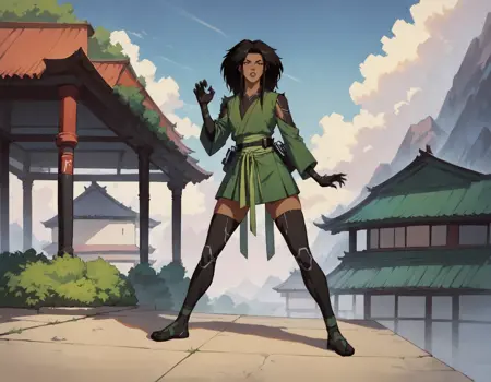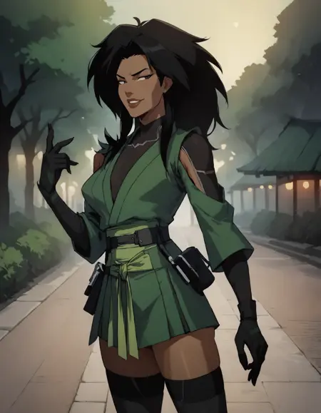 1girl, long hair, skirt, black hair, gloves, thighhighs, japanese clothes, black gloves, black thighhighs, dark skin, green kimono, dark-skinned female, bodysuit, dark grey eyes, belt,