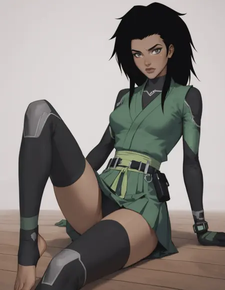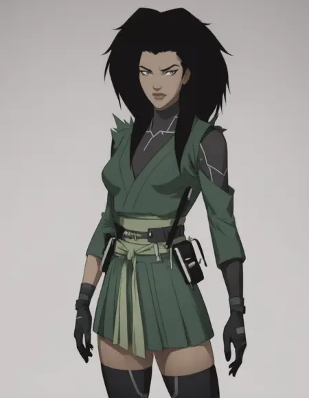 1girl, long hair, skirt, black hair, gloves, thighhighs, japanese clothes, black gloves, black thighhighs, dark skin, green kimono, dark-skinned female, bodysuit, dark grey eyes, belt
