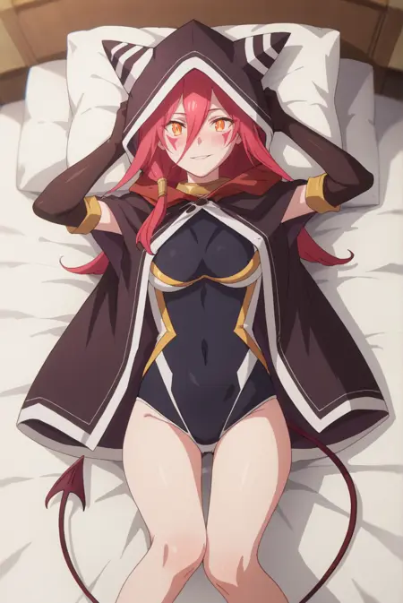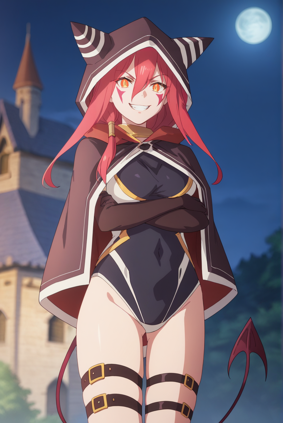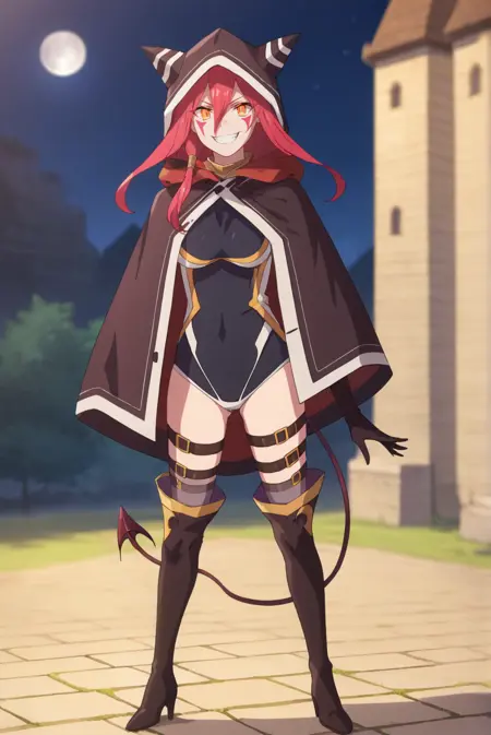 outfit_2,黑色带帽斗篷,帽子抬起,金色项圈,紧身衣,肘部手套,恶魔尾巴,大腿绑带,灰色长筒袜,大腿靴,高跟靴,